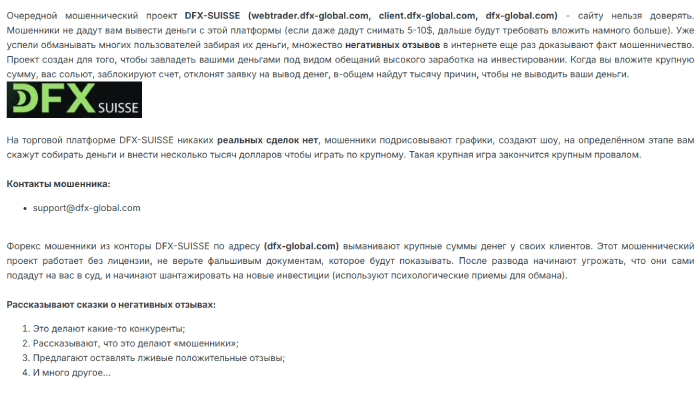Отзывы о DFX-Suisse тоже негативные и, именно поэтому данную платформу стоит обходить стороной. С каждым днем таких проектов становится только больше, а работа с ними заканчивается материальными потерями и это факт. Именно поэтому брокеров стоит проверять максимально внимательно.