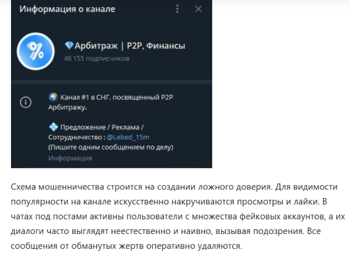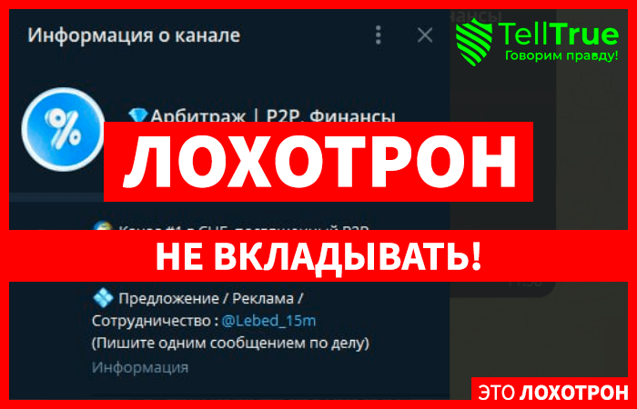 Канал 💎Арбитраж | P2P, Финансы (@Lebed_15m) является примером именно такого лохотрона, созданного аферистами. Ранее он назывался Финансы, Арбитраж | P2P PROCENT. Сейчас мошенники сменили название, чтобы обновить свою репутацию, ведь она достаточно плохая и опять обманывают простых людей.