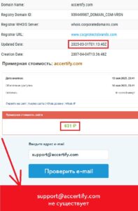Да, в описании на сайте Accertify говорится о «многолетнем опыте». Но давайте будем честны — дата активации ресурса подтверждает другое. Этот сайт начал свою работу 31 марта 2025 года. То есть чуть больше месяца назад. И за это время он уже успел собрать на себя жалобы, фейковые адреса, неработающие телефоны. Электронная почта support@accertify.com? Полностью фейковая.