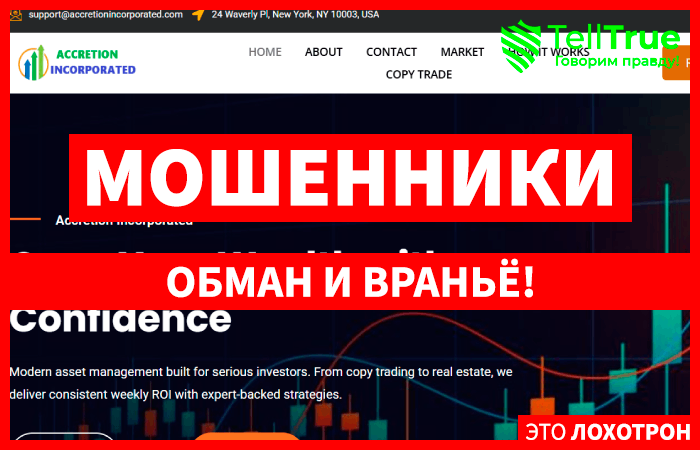 Вывести средства с Accretionincorporated у клиентов не выйдет, ведь ориентирована компания исключительно на прием финансов и, разыгрывает торги, не выпуская сделки на настоящие рынки. Таким образом можно понять, что перед нами наглые аферисты, обманывающие клиентов кухонным методом.