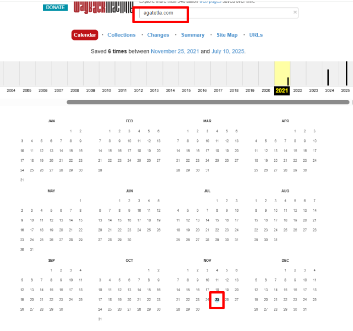Дополнительно мы посмотрели через веб Архив историю ресурса (https://web.archive.org/web/20190715000000*/agatetla.com). Он долгое время пустовал и только летом 2025 года мошенники начали на сайте вести активность.