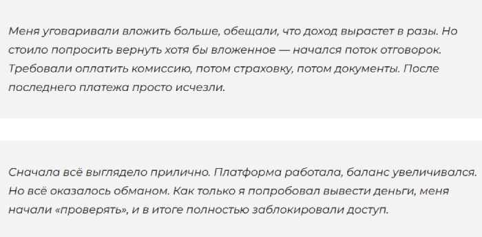 «Объявление этой организации нашла в Яндексе, гарантировали полную безопасность и не менее 5% прибыли при работе с аналитиком. Повелась, словно девчонка, из-за этого потеряла достаточно приличную сумму. Теперь хотелось бы вернуть средства, но боюсь к кому-либо обращаться, ведь всюду одни мошенники.»