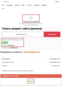 И знаете, что больше всего настораживает? Этот “проект” существует всего 19 дней. Да, вы не ослышались. Какая серьезная криптобиржа стартует вот так, без доверия, без репутации, и уж тем более — без документов? Тут даже обсуждать нечего. Все указывает на одно: akroCHANGE — это очередная однодневка, клонированная с другого, уже скомпрометированного сайта. Причем сделано это максимально дешево — домен обошелся создателям в символические 459 рублей. В буквальном смысле слова.