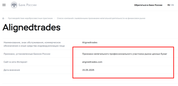 Отзывы об Alignedtrades негативные и, с каждым днем их только больше, так что от сотрудничества с проектом однозначно стоит удержаться, да бы не стать жертвой обмана. если брокер попал в немилость регулятора, то это однозначно не случайность и, сотрудничая с ним, трейдеры должны понимать, что риск потерять средства фактически стопроцентный.