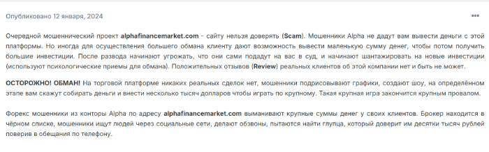 Да и отзывы об Alpha Market Investment, оставленные реальными клиентами, только подтверждают факт мошенничества организации, соответственно стоит подальше держаться от представителей этой шарашкиной конторы, да бы не попасть на обман и, не потерять из-за мошенников финансы. брокеров жуликов больше, чем проверенных компаний и, об этом стоит помнить.