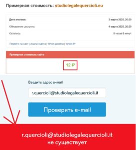 Еще один момент — стоимость площадки. Проверяем через Seolik, видим смешную цифру в 12 рублей. Дешевый веб-ресурс, на который никто не тратился. О серьезном бизнесе речи не идет. Если добавить сюда отсутствие нормальной контактной информации, кроме фейковой почты r.quercioli@studiolegalequercioli.it, картинка становится окончательно ясной. Написать можно, но получите ли ответ? Будьте осторожны. Если перед вами юридическая площадка с сомнительными лицензиями или вовсе без них, дешевым сайтом и минимумом контактов — не рискуйте!