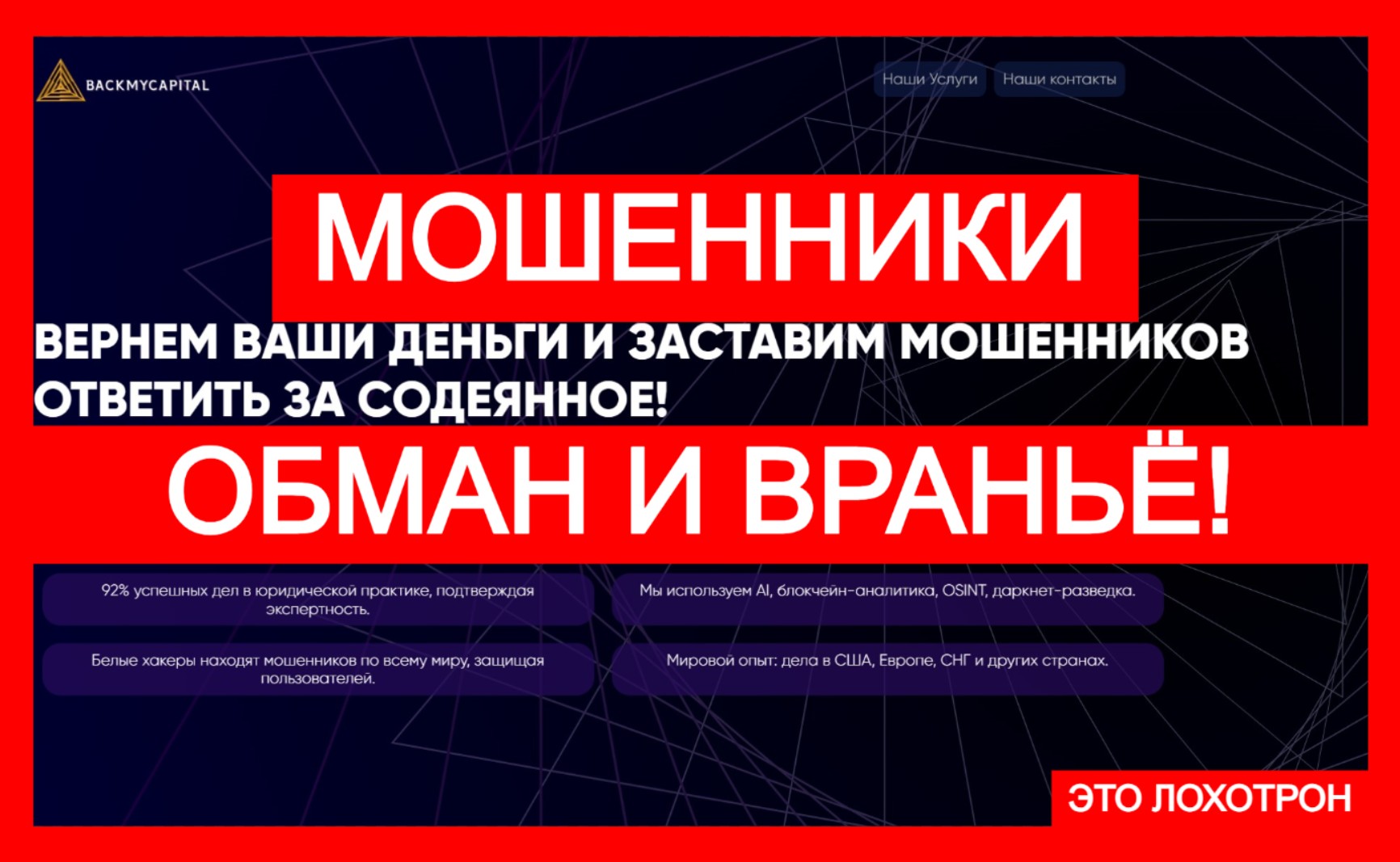 Однако если взглянуть глубже, буквально на пару деталей, начинаешь замечать странности. Сайт backmycapital.com производит крайне сомнительное впечатление. Мы изучили его внимательно. Что бросается в глаза сразу? Полуфункциональные страницы, пустые ссылки на соцсети, стандартные шаблоны, никакой конкретики ни по юристам, ни по кейсам, ни по процедурам. И все это сопровождается типичным «мы — команда профессионалов, спасающая ваши средства». Честно? Звучит как дежавю. Такое мы уже видели — и не раз.