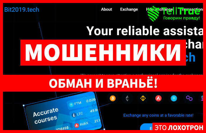 Примером очередного обменника, созданного мошенниками для кидалова простых людей, является проект Bit2019.tech. созданный на днях сайт пытаются выдавать за авторитетный обменный ресурс с прозрачными условиями и комиссиями. Но эти мифы развенчиваются об неприятную реальность очень быстро.