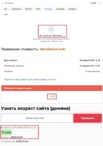 Мы решили копнуть глубже. Что мы выяснили? Ну, во-первых, сайт bitcofusion.com был зарегистрирован сравнительно недавно — 24 марта 2025 года. То есть ресурс молодой, но даже не в этом проблема. Всего 27 дней назад. А для платформы, которая якобы проводит десятки операций в день — это ничтожный срок. Добавьте сюда еще и интересный факт — сайт стоит всего лишь один рубль. Да-да, все настолько плохо.