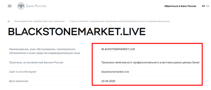 Примером фальшивого брокера, созданного для кидалова обычных людей, назвать можно организацию BLACKSTONEMARKET.LIVE. созданную недавно платформу позиционируют, как надежного и проверенного брокера, хотя на самом деле ее создали мошенники на коленке и, продвигают для выманивания денег.