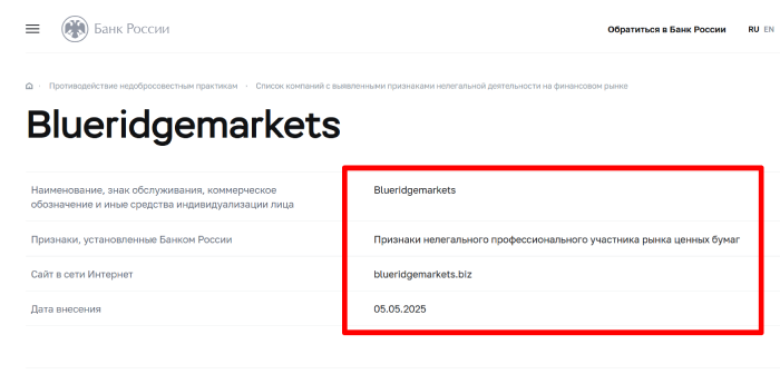 Брокер Blueridgemarkets – пример типичной дешевой организации, созданной мошенниками с целью выманивания денег. Была запущена платформа недавно, но ее позиционируют в роли проверенного биржевика, что работает немало времени, прозрачно и на результат. Перед нами якобы инновационная компания, предлагающая лучшие условия, массу инструментов и лицензированная, но это не так.