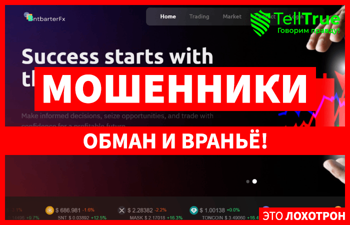 Проект BntbarterFx – это очередной фальшивый брокер, что обманывает простых людей. Данная организация была основана менее года назад и выглядит весьма примитивно, но на официальном сайте проекта нарисована просто колоссальная статистика и, существует она для привлечения внимания новичков. Тут клиентам готовы рассказать о безупречности работы компании и пообещать чуть ли не золотые горы, а на самом деле, пользователей просто кидают.