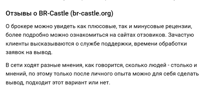 Вывести средства с BR-Castle нельзя, чего-то другого ждать при взаимодействии с нелицензированным лохотроном и не следовало. Перед нами мошеннический проект, что был создан с целью выманивания депозита, имитации торгов и наглого кидалова простых людей. Именно поэтому связываться с мошенниками категорически не стоит.