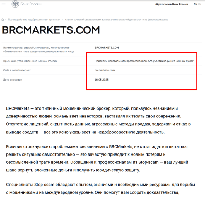 Отзывы о BRCMARKETS.COM, оставленные реальными клиентами, являются негативными и, это еще раз доказывает истинные мошеннические намеренья проекта. Данный брокер гарантированно попадает в черный список, поскольку является мошенником и, обманывает простых людей. И таких организаций много, так что стоит быть осторожнее.