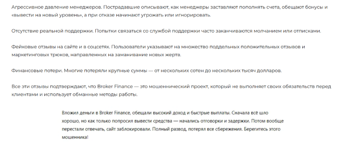 Именно поэтому работать с данным брокером и не стоит, ведь его представители умеют только кидать на деньги. когда люди собираются выводить средства с Broker.finance, оказывается, что это невозможно вообще. Это и не странно, ведь биржевик создал красивую рекламу и иллюзию доверия, да бы в его карманах люди оставили побольше финансов.