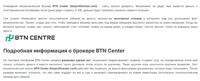 Если внимательно читать также отзывы о BTN Center, оставленные реальными людьми, то можно утвердительно сказать, что перед нами мошенническая организация и, она обманывает простых людей. Соответственно работать с представителями этого проекта нельзя, от них нужно бежать подальше, да бы не потерять свои финансы.