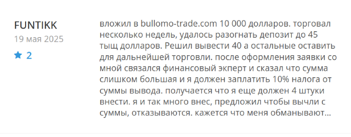 Люди якобы торгуют, даже видят минимальные результаты, затем собираются вывести средства с Bullomo Trade, но оказывается, что сделать этого нельзя вообще и пользователи остаются полностью разочарованными. Именно поэтому работать с данным лохотроном категорически не стоит, ведь его создали мошенники с целью выманивания денег.