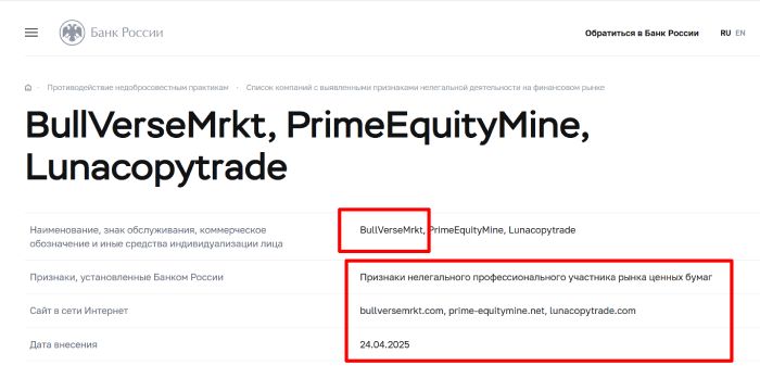 Компания BullVerseMrkt – очередной свежий представитель черного списка финансового регулятора. Проект достаточно молодой, но активное его продвижение, как надежной и проверенной компании вводит людей в заблуждение. Клиентам предлагают многочисленные торговые инструменты, их привлекают на липовые терминалы, разыгрывают успешно торговые процессы и обманывают.