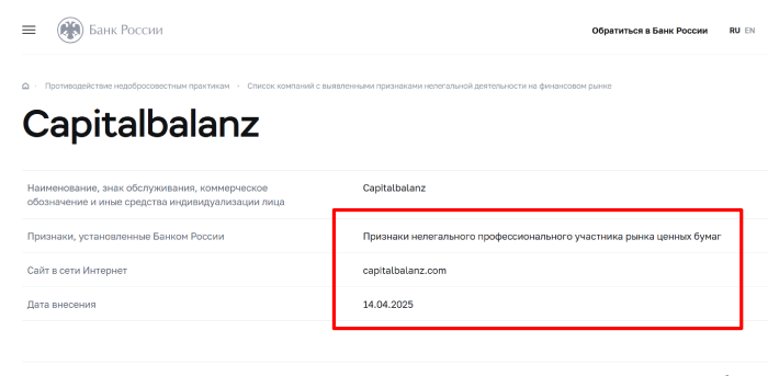 Брокер Capitalbalanz – пример мошеннической организации, обманывающей клиентов на каждом шагу. Этот проект был создан мошенниками с целью выманивания финансов, чем занимается очень активно уже 22 дня. На сайте самой компании пишут о предоставлении услуг трейдерам с 2024 года и, это неправда.