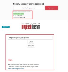 Мы заглянули и в Веб-Архив (https://web.archive.org/web/20250710231714/http://capriongroup.com/), где можно проследить историю сайта. Оказалось, что домен вообще пустовал. Это говорит о том, что Caprion Group — новый фейковый проект, созданный для выкачивания денег с доверчивых инвесторов.