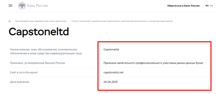 Примером типичного мошенника брокера, создавшего свой лохотрон для выманивания денег и кидалова, является организация с наименованием Capstoneltd. Эта платформа была создана недавно и, ее основателями являются мошенники, кидающие на деньги клиентов. Да, свою работу аферисты успешно рекламируют и продвигают, но глубинная проверка этого сайта дает понять, что с ним связываться не стоит.