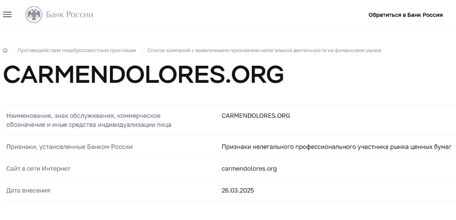 Брокер CARMENDOLORES.ORG является примером одного из нечестных биржевиков, что работает исключительно на присваивание денег. Эту организацию мошенники запустили сравнительно недавно, сайту всего 16 дней, но его активно рекламируют в интернете для того, чтобы выманивать с пользователей финансы.