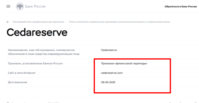 Естественно, вывести средства с Cedareserve не получится, у этих жуликов такой опции нет. соответственно пользователям стоит обходить молодой лохотрон стороной. Кроме того, данную организацию добавил Центробанк в черный список и, работа с ней однозначно не может привести к каким-либо результатам.