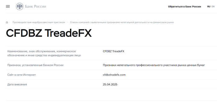 В интернете появляются негативные отзывы о CFDBZ TreadeFX и работе проекта, а таких с каждым днем становится только больше. это еще один повод для клиентов обойти нелицензированную организацию стороной, да бы не стать ее очередной жертвой. Количество подобных проектов только пополняется и, с ними работать не стоит.