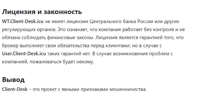 Если поискать и прочесть отзывы о Client-Desk, опубликованные в интернете, то можно еще раз подтвердить факт того, что перед нами обманщики и, они кидают простых людей. Сотрудничество с такими организациями всегда имеет ряд негативных последствий, соответственно от них держаться стоит подальше.