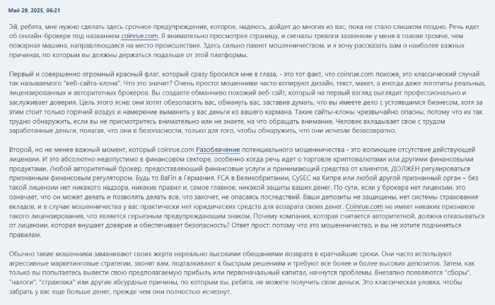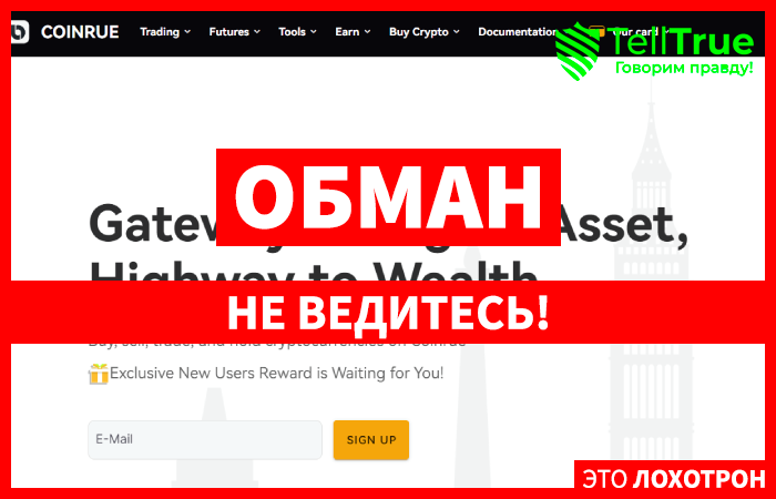 Примером криптобиржи, что используется мошенниками именно для кидалова со связками, назвать можно проект Coinrue. Первым признаком того, что перед нами мошенники, является шаблонность дизайна сайта и его очень молодой возраст. Второй признак — это отсутствие нормативно-правовой базы, то есть, нет регистрационных данных и информации о лицензировании.