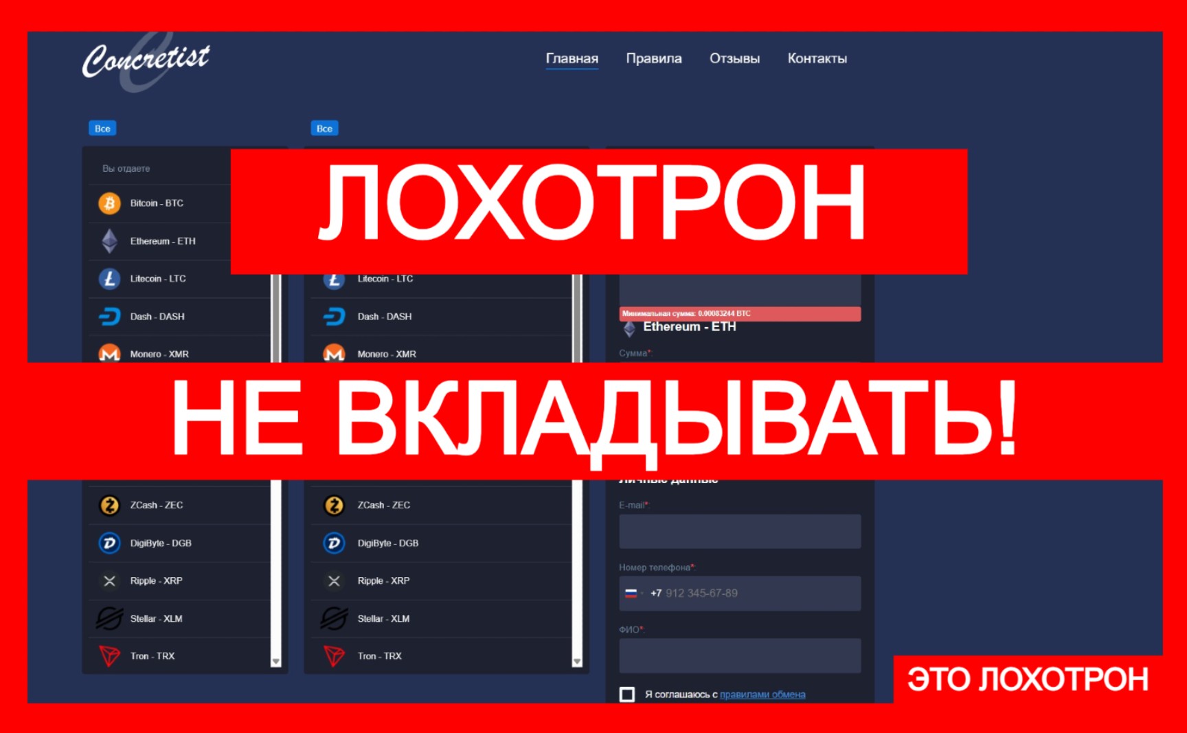На первый взгляд — ничего необычного. Якобы обменник встречает пользователей ярким слоганом о высоких технологиях, быстроте транзакций и полной безопасности. Но стоит копнуть хоть немного глубже — и вся красивая ложь исчезает, оставляя за собой только разочарование и пустой кошелек. Concretist — это типичный пример мошеннической схемы, которая замаскирована под легальный криптовалютный сервис. Причем настолько шаблонно, что становится непонятно, на кого вообще был рассчитан этот спектакль.