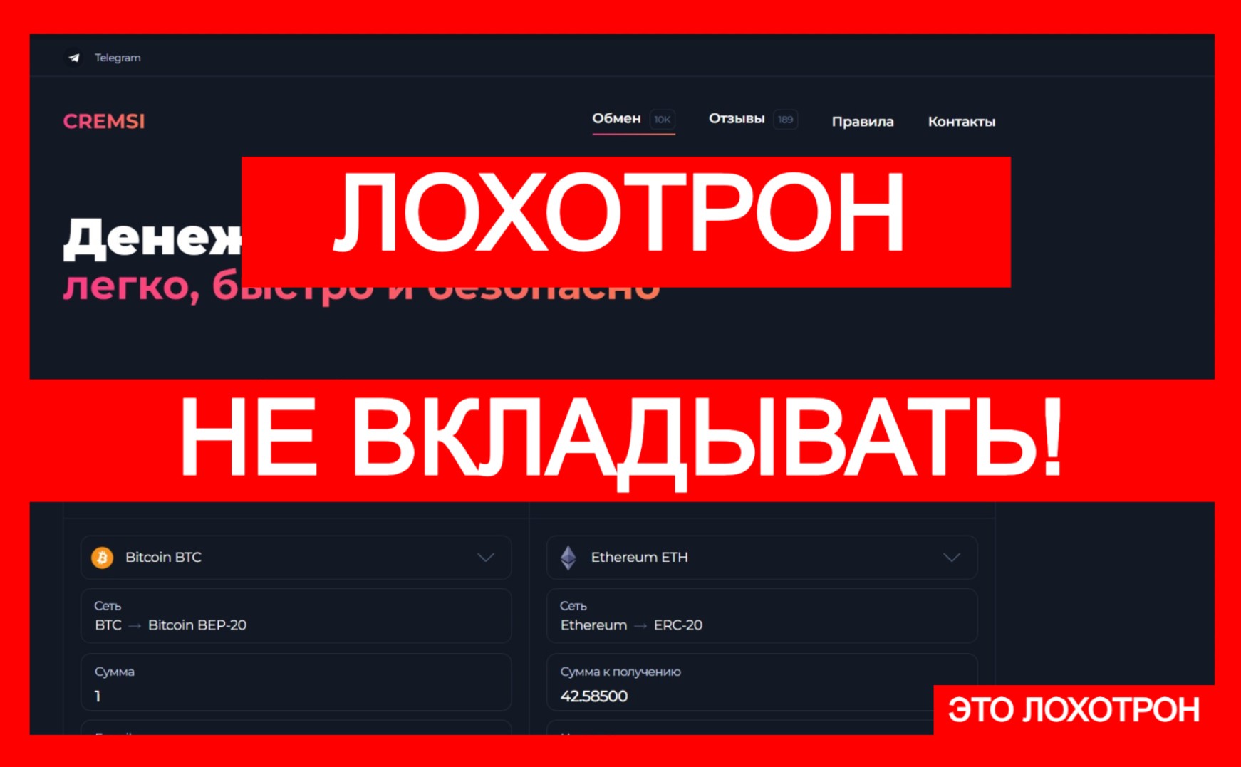 Проверили ли мы их через надежные источники? Конечно. Зашли на BestChange — а Cremsi там нет. Ни в списках, ни в архивах. А ведь нормальные обменники стремятся туда попасть. Это своего рода знак качества. Репутация, знаете ли, сегодня решает многое. Но у этой платформы ее попросту нет. И не было. Мы не можем не поделиться выводом, который стал очевиден уже после первых минут анализа. Перед нами не компания и не сервис. Это ловушка. Хитрая, простая, рассчитанная на доверчивость и неопытность. Чем громче они кричат о «выгодных условиях» и «высокой доходности» — тем дальше стоит держаться.