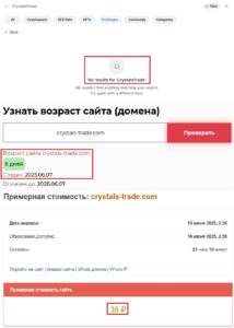 Вы загляните на сайт — crystals-trade.com — и поймете, что он собран на типичном шаблоне. Таких уже было немало. Чуть измененное название, слегка подправленный текст, но суть одна и та же. Более того, домен существует всего-то 8 дней. Не месяц, не полгода. Согласитесь, сложно говорить о доверии, когда у ресурса даже нет за плечами элементарной истории. А стоимость сайта? 35 рублей. Это не образно — буквально. Разве солидная компания, работающая в финансовом секторе, может позволить себе подобное? Очевидно, нет.