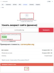 Проверив проект через внешние сервисы, мы выяснили, что ему всего 13 дней — домен зарегистрирован 10 апреля 2025 года. Ну и как вы думаете, можно ли за такое время создать по-настоящему надежную биржу? Очевидно, нет. А если еще и домен стоит символические 4 рубля, то это и вовсе становится похоже не на бизнес, а на короткую аферу, которую свернут, как только первые пострадавшие начнут писать отзывы.