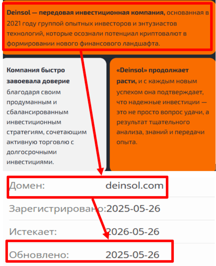 - время основания компании – пишут, что начали работу в 2021 году, но сайт был зарегистрирован в конце мая 2025 года (https://www.whois.com/whois/deinsol.com);