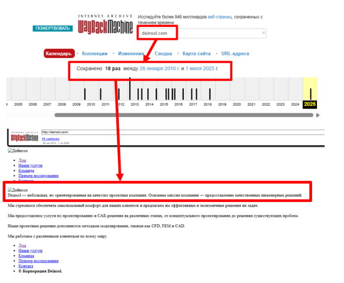 Также мы смотрели историю проекта через Веб Архив (https://web.archive.org/web/20250000000000*/deinsol.com) и ранее на этом ресурсе был инженерный сайт с созвучным нашим героям названием. Так бывает часто, что домены продаются и, в случае наших героев, они купили ресурс 2 месяца назад.