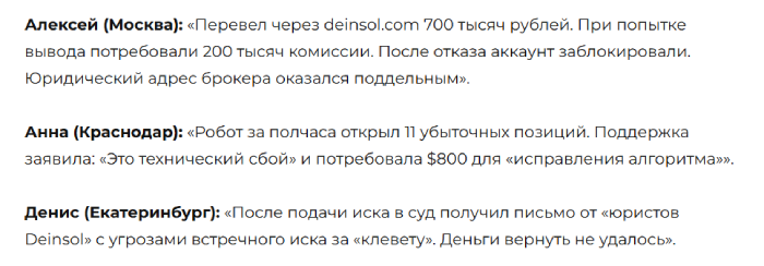 Очередной криптовалютный лжеброкер запустил свою работу на просторах рунета. Он пишет на своем сайте «Deinsol — передовая инвестиционная компания, основанная в 2021 году группой опытных инвесторов и энтузиастов технологий, которые осознали потенциал криптовалют в формировании нового финансового ландшафта», но верить этому не стоит. Лжеброкер Deinsol (deinsol.com) всеми силами пытается выдавать себя за того, кем не является в самом деле и, от данной платформы стоит держаться подальше.