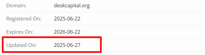 - период работы проекта – на сайте не указано конкретное время основания брокерской платформы, а вот проверка домена показывает, что проект зарегистрировали в июне 2025 года (https://www.whois.com/whois/deskcapital.org), то есть сайт совсем новый.