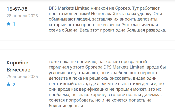 Читая реальные о DPS Markets Limited отзывы, написанные пользователями интернета, можно только подтвердить факт того, что от данного проекта стоит бежать подальше. Перед нами типичные жулики, что занимаются не торговыми реальными процессами, а обманом и, взаимодействие с ними является прямым путем к материальным потерям немалого масштаба.