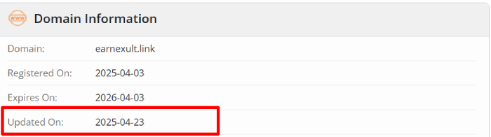 - время существования организации – проект якобы основан в 2017 году, а проверка возраста сайта показывает, что ресурс создали в апреле 2025 года (https://www.whois.com/whois/earnexult.link);