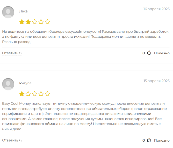 Человек изначально видит то, что ему нравится, вот и вносит немалые депозиты. Далее пользователь якобы зарабатывает все больше и его азарт растет, так что суммы в оборот идут немалые. И, как только человек планирует вывести средства с EASYCOOLMONEY, его ждут полный провал и разочарование. Оказывается, что такой опции вообще не предусмотрено, а брокер обманывает на липовом терминале.