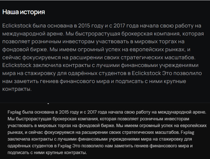 Примером новой брокерской организации, что была создана одними из серийных мошенников для выкачивания средств, является проект Eclickstock. Сайт существует год, его собственники говорят о том, что уже больше десятка лет предоставляют услуги, а еще описывают красиво легенду своей деятельности и она не соответствует реальности.