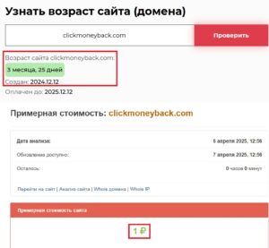 Если вы зайдете на их сайт, clickmoneyback.com, то, возможно, на первый взгляд ничего подозрительного не заметите. Все вроде бы выглядит прилично. Только вот есть одна маленькая деталь: домен существует всего 3 месяца и 25 дней. То есть, они якобы работают годами, а по факту — всего несколько месяцев? Неувязочка, правда? Да и поисковые системы стали куда реже показывать этот сайт в результатах. Сигнал очень даже тревожный.