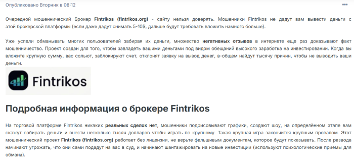 Отзывы о Fintrikos, написанные реальными клиентами, являются отрицательными, ведь перед нами типичная мошенническая организация, обманывающая простое население. С каждым днем таких проектов становится только больше и, сотрудничество с ними заканчивается исключительно негативно.