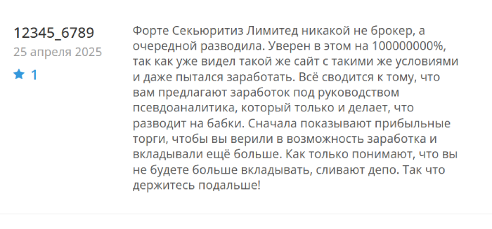 Читая в интернете на разных рейтинговых ресурсах отзывы о Forte Securities Limited и работе проекта, сказать можно только о том, что его представители нагло обманывают. Именно поэтому рассчитывать на честность представителей проекта и профит с платформы не стоит, поскольку этого не будет.