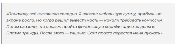 «С представителями этого брокера познакомилась через социальные сети. Обещали мне хороший доход без рисков и с аналитиком. Согласилась на свою голову и потеряла крупную сумму. Теперь даже не знаю, как вернуть деньги и удастся ли это вообще, так что стоит быть осторожнее.»
