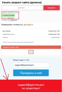 И вот интересный момент: сколько, по-вашему, должен стоить сайт серьезного финансового посредника? Сотни тысяч рублей, может, даже миллионы? А вот аферисты не заморачиваются — домен зарегистрирован за… 0 рублей. О какой серьезности тут может идти речь? Контактные данные — еще одна фикция. Указанная почта support@giavrina.pro — это просто фейк. Хотите позвонить в поддержку? Увы, номера телефона нет.