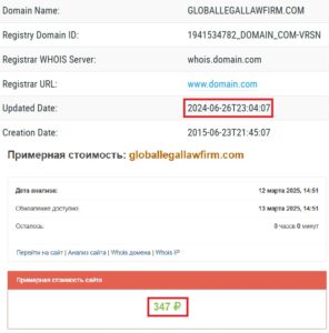 То есть вся история компании — фальшивка, придуманная ради убедительности. А теперь еще один нюанс: стоимость этого «юридического гиганта» — всего 347 рублей. Серьезно? Легальная компания с многолетним стажем, оцениваемая в столь мизерную сумму? Итог предсказуем. Global Legal Law Firm — не юридическая компания, а хорошо продуманная ловушка. Будьте внимательны, не дайте мошенникам второй раз поживиться на вашем доверии.