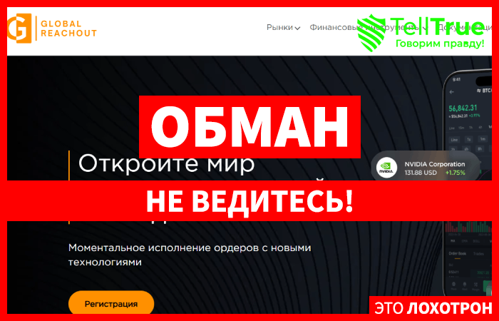 Брокер Global Reachout – пример мошеннической организации, что была создана для кидалова клиентов. На своем официальном сайте представители этого проекта разместили красивую статистику, они уверяют, что предоставляют во многих странах свои услуги, работая прозрачно и на результат, а по факту просто привлекают на фальшивый терминал с целью кинуть.