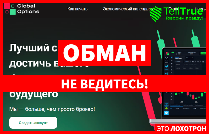 Клиентам активно рассказывает о том, что им предоставлен «Лучший способ достичь вашего финансового будущего» очередной брокер мошенник. Организация GlobalOptions (globoptions.com) активно занимается выкачиванием финансов и, презентует себя в роли престижного биржевика, продвигая красивую рекламу в сети, так что стоит стать осторожнее.
